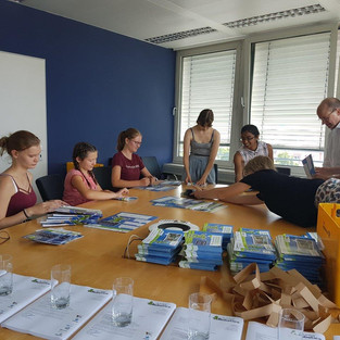 Anschließend wurden die 850 Briefe an die Schulen aus Bayern und die benachbarten Bundesländer mit vollem Einsatz zum Versand vorbereitet. Nach ein paar Mal Flyer zusammen mit den Plakaten und den Anschreiben in einen Umschlag stecken hatte jeder den Dreh raus und das Kuvertieren ging immer schneller von der Hand.